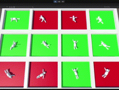 I developed the infant model and trained the reinforcement learning agent within the Unity game engine, leveraging the Unity ML-Agents Toolkit. This setup allowed Python-based deep reinforcement learning to interact with Unity as the environment. I scripted the agent’s actions, observations, and rewards in C#, providing four continuous action options for limb torque and two discrete actions for arm rotation axis selection. The agent made eight observations per step, tracking limb and torso rotations and chest marker height. Rewards were structured to encourage complete rollovers within a 30-second window, with partial rewards based on marker proximity to the floor when the timer elapsed.